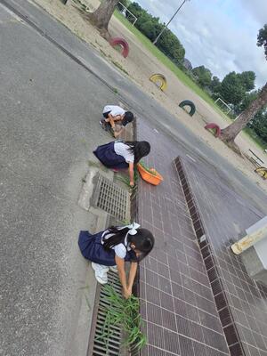 「玄関に草が生えているので、学校がいたまないように草を取ってる」