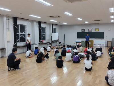 胴着とと面を付けた子供たちが、真剣にお話を聞いています。