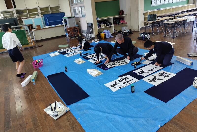 塾長と子どもたちが、熱心に習字に取り組んでいました。