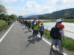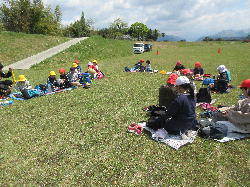 歓迎行事の後、下町の白川に遠足に行き、登校班ごとに弁当を食べ、仲良く遊びました。