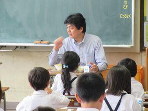 大津町の総務部長 藤本聖二さん が1年生の教室へ給食に食べにおいでいただきました。