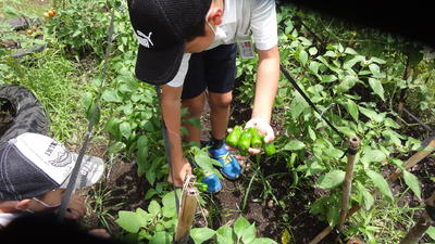 ミニトマト、ピーマンを収穫して喜んでいました。