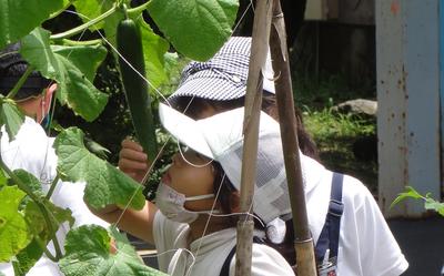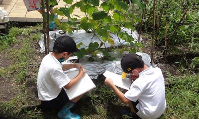 PTA副会長の山本さんからいただいたミニトマト、なす、オクラ、ピーマン、キュウリの苗はすくすく育っています。今日、2年生が生活科で観察をしました。