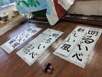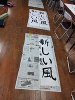 一般的に小学校で使う紙は、小型条幅という机の上で書ける紙ですが、この巨大な紙に書くには、相当大きな筆と大量の墨(すみ)、そして体全体を使った動きが必要です。