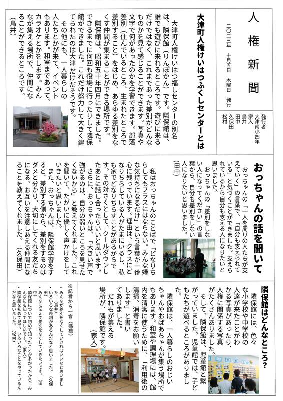 9月26日(火)に学習に行った大津町人権啓発福祉センター(隣保館)での学習がまとめられた新聞でした。