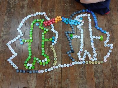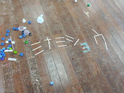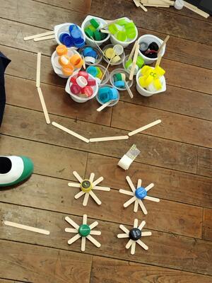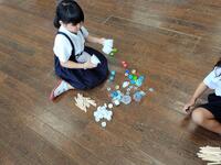 多目的室で、お家から持って来たペットボトルキャップなどを広げて、何か創るようです。