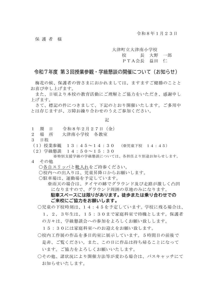 令和7年度 第3回授業参観・学級懇談の開催について(お知らせ)