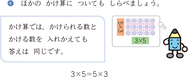 よく知られている交換法則「かけ算では、かけられる数とかける数をいれかえても答えは同じ」というものも2年生で出てきます。