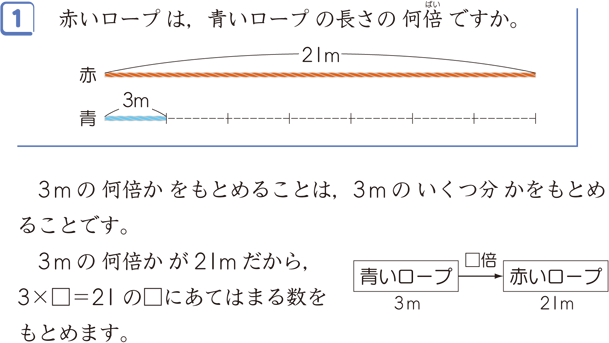 基準量と比較量を示しておいて、比較量が基準量の何倍になるのかを調べさせるときにかけ算の式が出てきます。