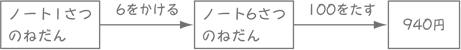 以下の問題は、『ノート一冊の値段を「もとにする量」とし、それを6倍した上で、さらに100円をたすと940円になった。では、元々のノート一冊の値段はいくらだったか。』という問題です。