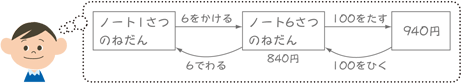 この時も、操作される量(値段)を前に、操作する量(かける数、わる数)を後ろにおいて式を立て、計算します。