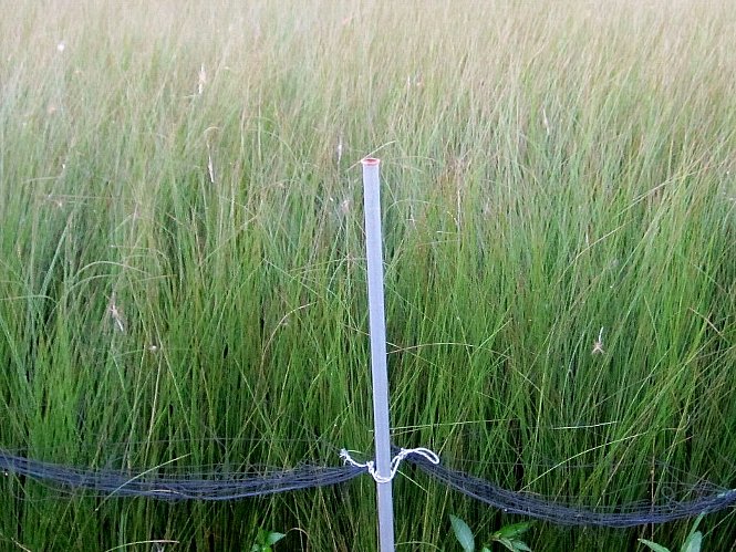 これは、校区内の藺草の様子です。藺草はある高さ以上に草丈が伸びると倒れてしまうので、杭を打ち、網をかけて刈り取りまで倒れないようにしておきます。
