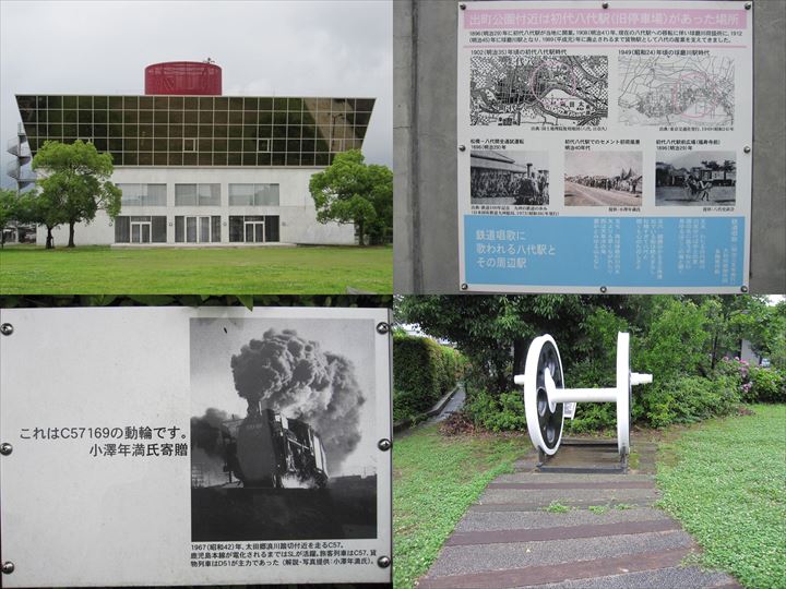 さて、今は、八代駅に貨物駅としての役割を移し、駅であったことをしのばせるものはほとんどありません。ただ、歴史を示すプレートが作られ、当時走っていたSLの写真や動輪が置いてあります。