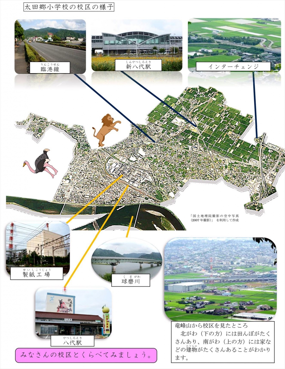〔太田郷小校区の形はライオンやダチョウの形によく似ていますね。皆さんの校区は何に似ていますか?〕