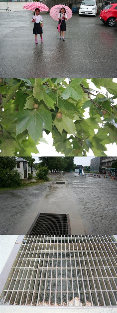 運動場と校舎の敷地の間には用水路があります。普段は、コンクリートのふたがしてあるのであまり気に留めないのですが、雨の日に中をのぞくと、すごい速さで水が流れていきます。