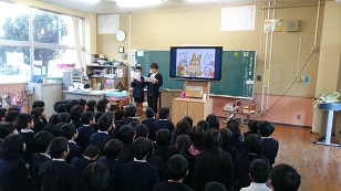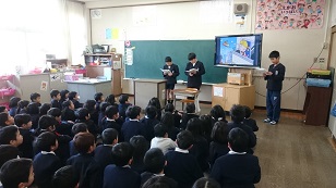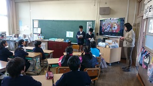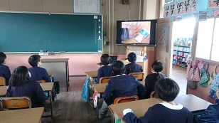 低学年の教室で読み聞かせをしています。 4年生は給食ができるまでのDVDを視聴しました。