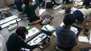 条幅に初挑戦。3年生は「美しい心」と書きました。