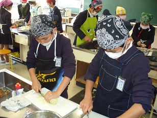 全員1個ずつ包丁でジャガイモの皮をむき、各班工夫してジャガイモを使った料理を作りました。