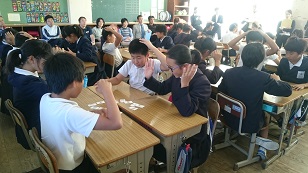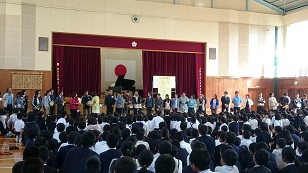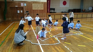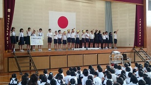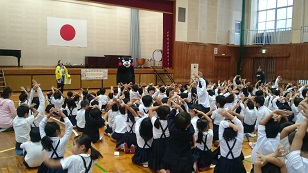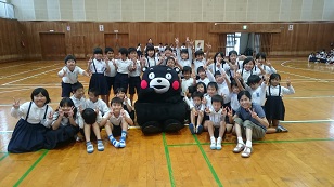 お勉強の後はくまモン体操 学級ごとに記念写真も