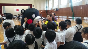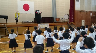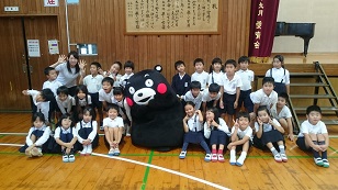 子ども達には、くまモンが登場することは極秘でした。くまモン登場に大興奮の子ども達。一緒に学習し、とても楽しい夢のある時間を過ごすことができました。