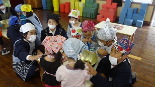 各班に分かれて、一緒に芋をつぶしたり、お話したり楽しい交流になりました。