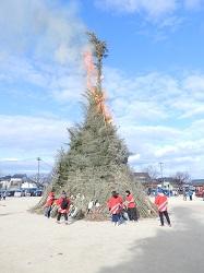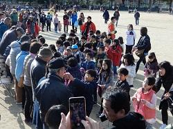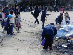 開会式、愛育会会長さん、校長先生の挨拶からはじまりました。そして、1年生の子供たちからは、来賓の皆様にすてきなメダルのプレゼントもありました。とてもかわいらしい1年生の後につづき、今年1年立派に成長してきた6年生が、やぐらに点火しました。みるみるうちに火は大きくなり、パチパチと大きな音を立てながら天高く上っていきます。火が落ち着いてからは、残り火で餅などをみんなで焼いて食べました。どんどやの残り火で焼いたお餅を食べると1年間健康に過ごすことができるそうです。子供たちも含め、太田郷の皆さんが1年間健康に過ごせますように・・・