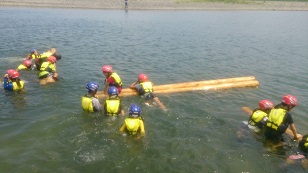 カヌー体験 丸太を使って水遊びをしています