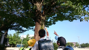 登校中、子ども達の指さす先には、何とせみの抜け殻が…。せみの抜け殻を見つけては、集めたり、探したりしています。太田郷っ子、暑さに負けず元気です。