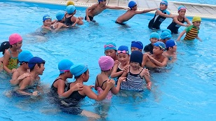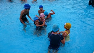 全員でじゃんけん列車をしたり、幼稚園生をおんぶやだっこをしたりして、水遊びを楽しみました。
