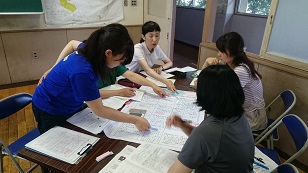 今日の授業の流れを説明されています。 班に分かれ、インタビューをしています。