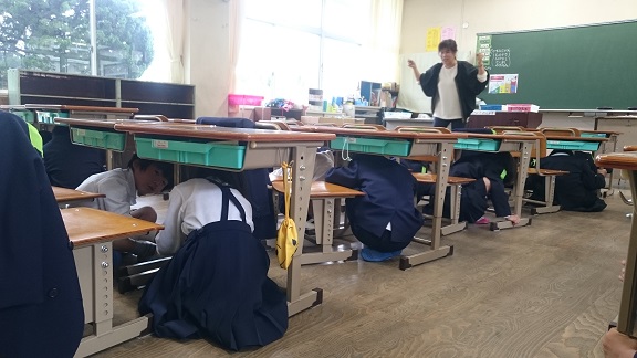 緊急地震速報にあわせて、机の下に隠れる1年生。