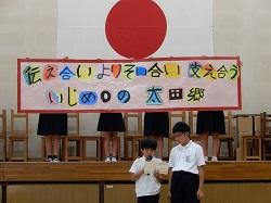 太田郷小人権委員会の子どもたちが「伝え合い よりそい合い 支え合う いじめ0の 太田郷」にしようと呼びかけをして、それぞれのクラスでどうしたら、そのような学校にできるかを話し合いました。