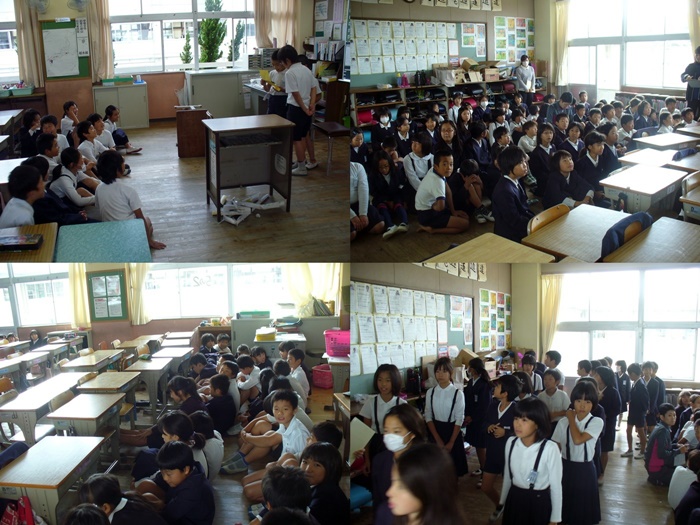 その前の地震津波避難訓練に引き続きの避難訓練だったのですが、雨のために外へ避難することができず、体育館へ避難しました。
