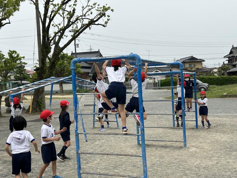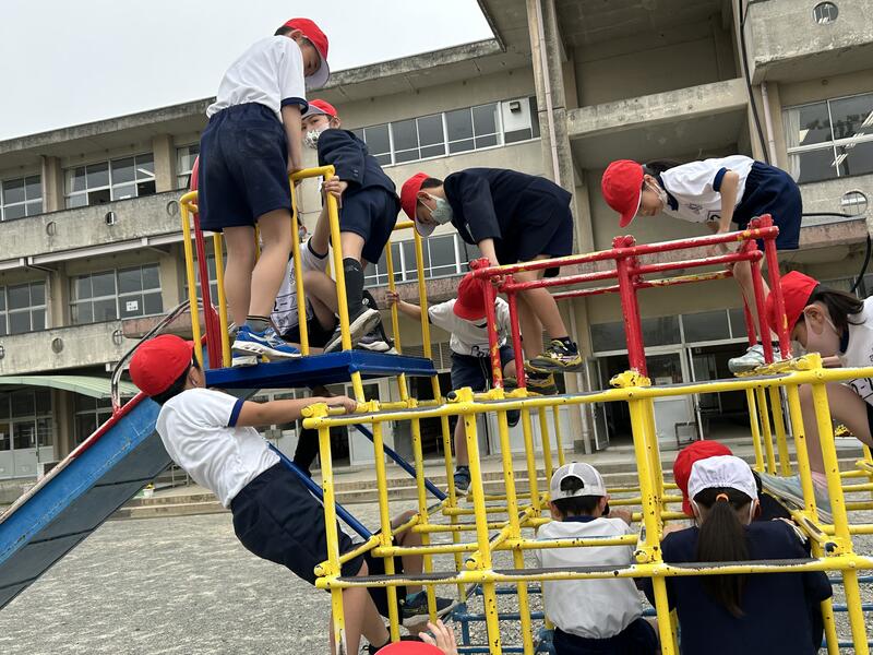 2年生の体育では、うんていやジャングルジム、ろくぼくや鉄棒など、様々な遊具で遊ぶ活動を行いました。