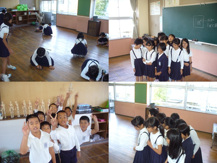 これは金曜日の授業の様子ですが、1m物差しを使って1㎡を床に描いてみました。