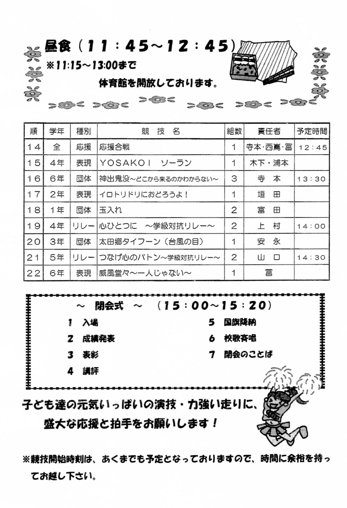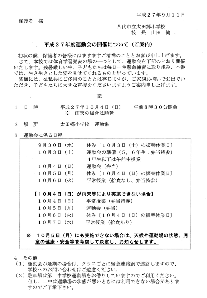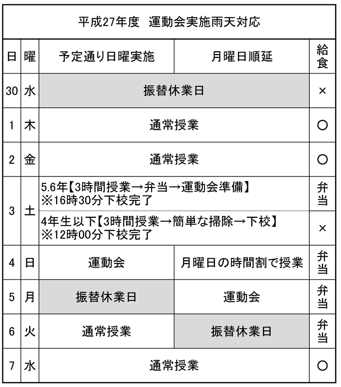 ※雨天順延の場合、4日(日)は通常授業になります。お弁当も必要です。時間割は、基本的に月曜日の時間割ですが、学級通信を必ずご確認ください。学年・学級によっては特別な時間割になっているところもあります。