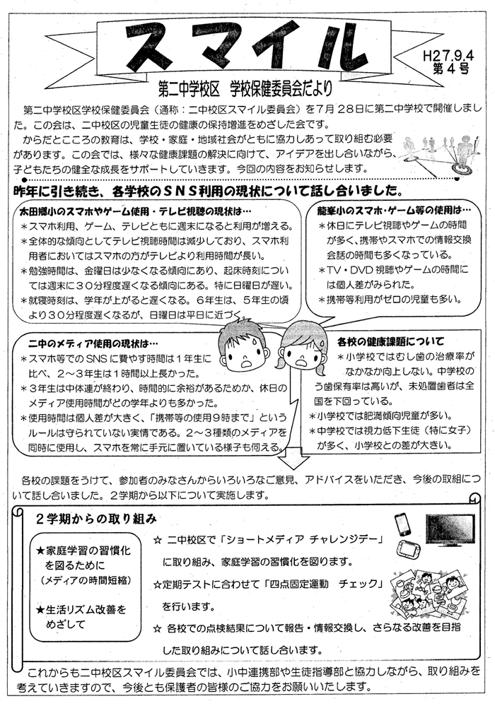 ↓第二中学校区学校保健だより スマートフォン等に関する調査結果が載っています。ぜひお子さんとの話し合いの材料にしてください。