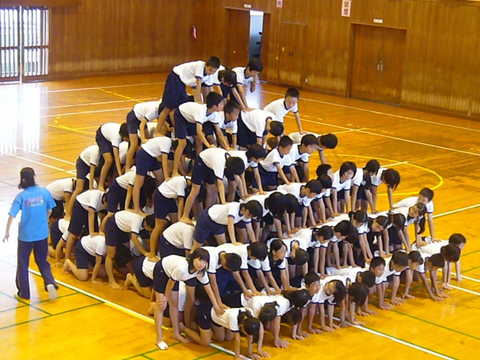 向こう側にも中にもたくさんの子供たちがいて初めてこのタワー(ピラミッド)が完成しています。