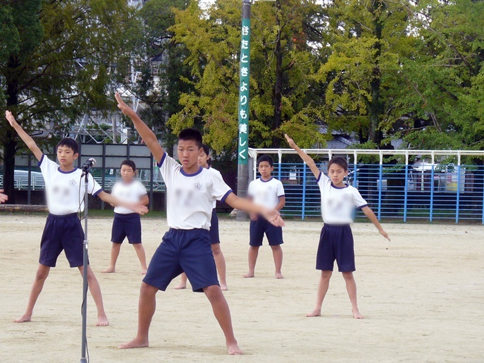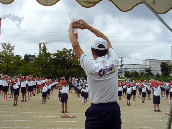 ↓ストレッチはとなりのトトロの挿入歌「風の通り道」 大きな背中は校長先生。