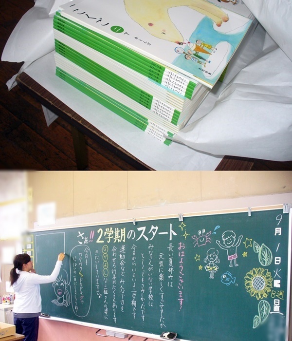下の写真は真新しい教科書です。教科書は基本的に年2回配ることになっています。2学期最初に配るのは各教科の下巻です。〔すべての教科というわけではありません。〕