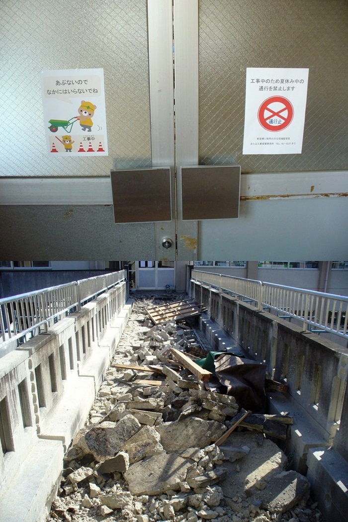下の写真は、三階の連絡通路です。まるで怪獣がやってきて壊したかのように見事に破壊されています。