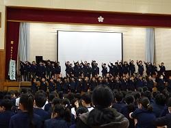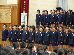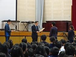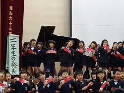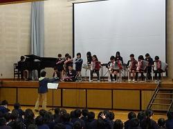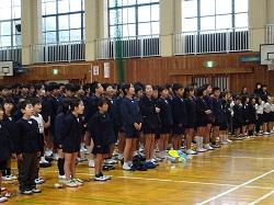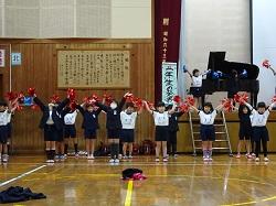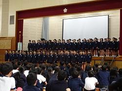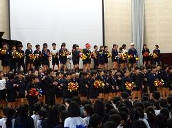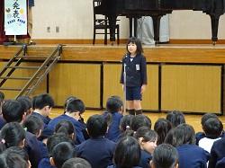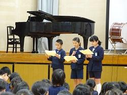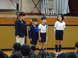 この集会が、全児童が集まる今年度最後の機会です。各学年の趣向を凝らした発表を通して、6年生との別れを惜しみました。