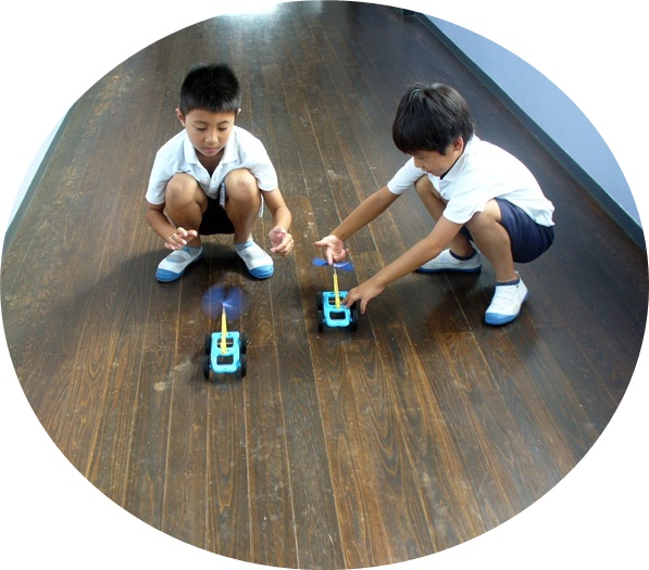 下は、風やゴムのはたらきを調べるためにゴム動力のプロペラを回し、その力で車を走らせているところです。