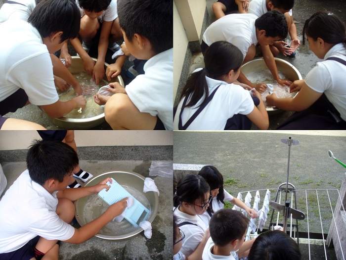 子供たちは、自分や家族の靴下を家から持ってきて、手洗いをして汚れの落ち方を確認しました。
