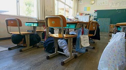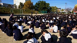 今回は予告なしの避難訓練でした。緊急地震速報が流れると、机の下に隠れる子どもたち。その後、理科室から出火したということを想定して運動場に避難しました。