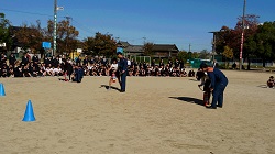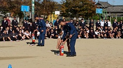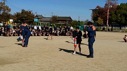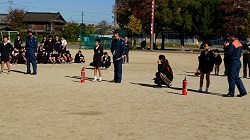 また、消防署の方にも来ていただいて、避難の様子を見ていただいたり、消火器の使い方について教えていただいたりしました。