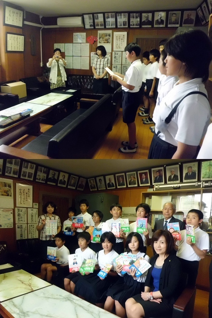 〔お礼の言葉を述べる図書委員長と委員会の子どもたち〕