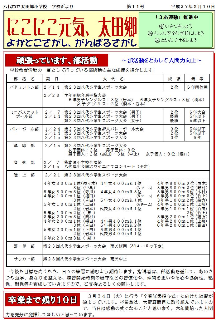 やつしろしりつおおたごうしょうがっこうです。 合(愛)言葉は、「にこにこ元気! 太田GO!!」