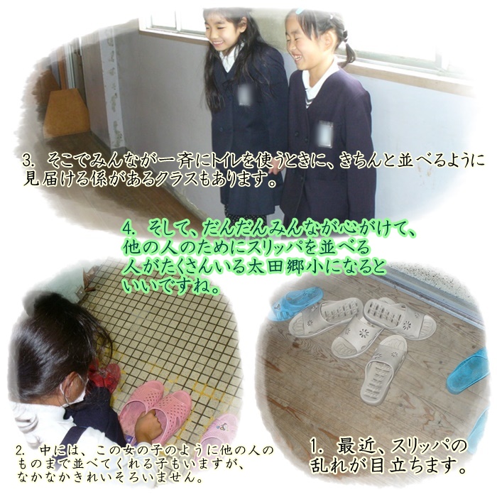 (全校でしているわけではありませんが)低学年のあるクラスでは、子どもたちに意識付けをするために、一斉にトイレに行かせた時間などに、スリッパ並べをしているか見守る係があります。もちろん、意識付けのためで、係がなくてもできるようになるのが一番ですが、意識が高まるまでは、いろいろな手立てを講じながら、だんだん子どもたちが「ほかの人のことも考えよう」と思ってくれるようになればなあと思います。