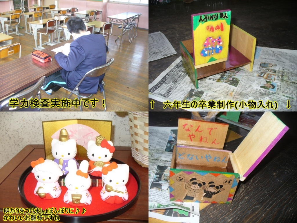 左下は、校長室の前に飾ってあるキャラクターおひな様です。かわいいですね。実は太田郷小学校には立派な雛壇があるのですが、古くて重厚なもので、出して飾るのがなかなか大変です。今年できるかなあ…。